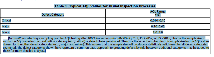 AQL | For release of the batch, the minimum AQL should be为了放行批次,最低 AQL 应为 Critical: 0 defects within the AQL samples 严重:AQL 样品中 0 个缺陷 Major: ≤ 0.65 AQL 主要:≤ 0.65 合格标准 Minor: ≤ 4.0 AQL 微小:≤ 4.0 合格质量限 If an AQL limit is exceeded, the whole batch may be re-inspected 100% followed by a second AQL manual inspection (see 6.). This process can be repeated, but must be justified by an investigation and should not be performed more than 2 times in maximum. It is recommended to have tighter AQL limits for the repeated AQL testing. Tightening of AQL limits is possible by two ways: Stay on the AQL sample size and use the next (tighter) AQL limit- OR: Stay on the AQL limit and use the next (higher) AQL sample size. 如果超出 AQL 限制,则可能要对整个批次进行 100% 重新检验,然后再进行第二次 AQL 人工检验(参见 6.)。该过程可以重复,但必须通过调查证明其合理性,并且最多不应执行超过 2 次。建议对重复的 AQL 测试设置更严格的 AQL 限制。可以通过两种方式来收紧 AQL 限制:保留 AQL 样本量并使用下一个(更严格的)AQL 限制 - 或者:保持在 AQL 限制并使用下一个(更高)AQL 样本大小。 | Critical defects (those that pose the greatest risk to the patient) should be assigned an AQL with a very low value. Often, the accept number (the number of defective units allowed in the sample) for a critical defect is zero. Major and minor defects, which pose less risk to the patient, will have increasing (less stringent) AQL values and accept numbers greater than zero. Further definition and discussion on defect categories are found in 5.1 Defect Classification. Table 1 shows the range of AQL values typically used for visual inspection processes (46). |
